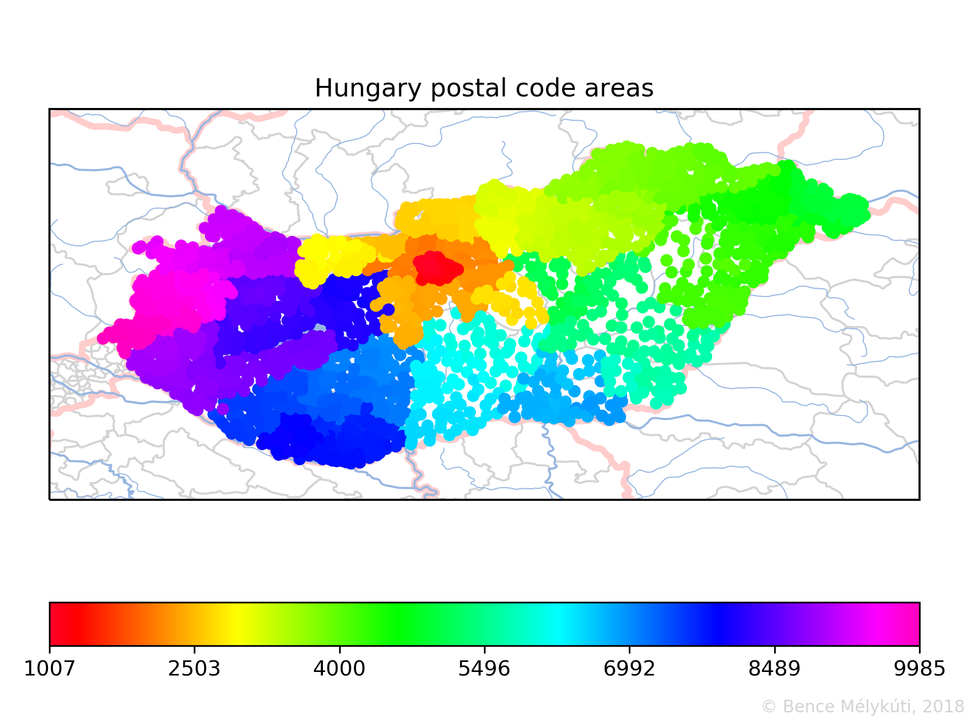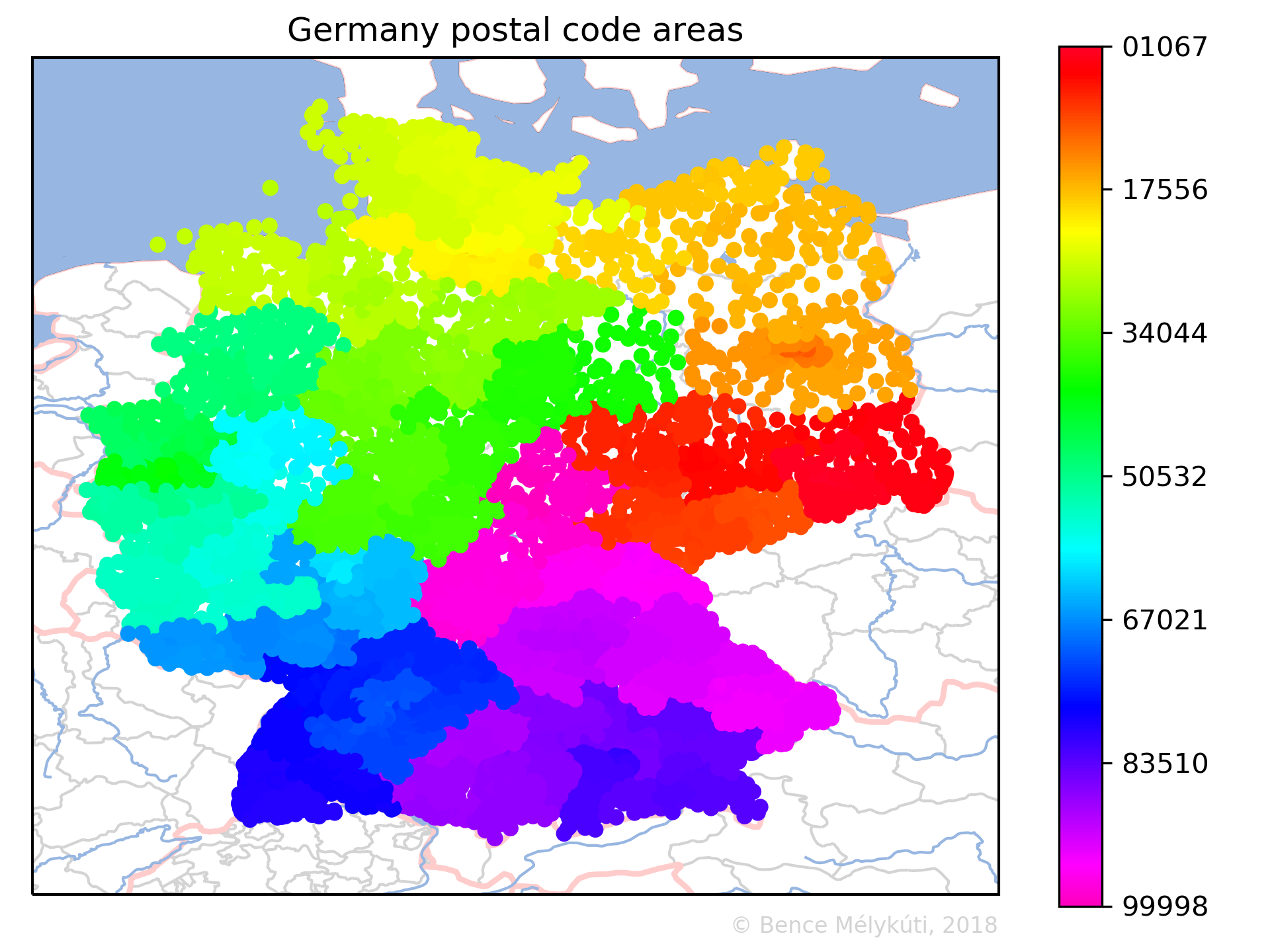 But there are only few countries whose postal code areas have been entered into OpenStreetMap. For the United States of America, I used the quasi-official source for the ZIP Code Tabulation Areas (ZCTAs) (see also this), the US Census Bureau website. The postal code areas are closed polygonal paths. I reduced these areas to single points by averaging the coordinates of the paths’ vertices. These points are displayed using colour-coding.